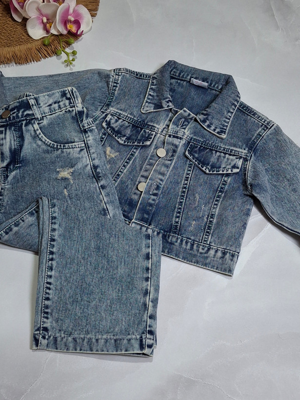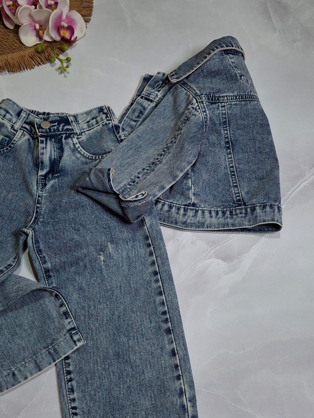 ست دخترانه/کت کراپ وشلواربگ/دکمه فلزی/پشت شلوار کشی ودکمه وزیپ خور